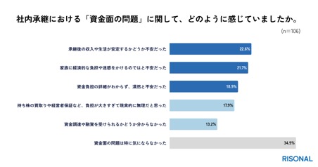 社内承継における資金面の課題を尋ねたところ、「収入や生活面での安定が不安」が22.6%、「家族への負担が心配」が21.7%、「詳細が分からず不安」が18.9%という結果になりました。一方で「特に気にならなかった」と回答した人も34.9%で、資金面の受け止め方には個人差があることもわかりました(n=106)。